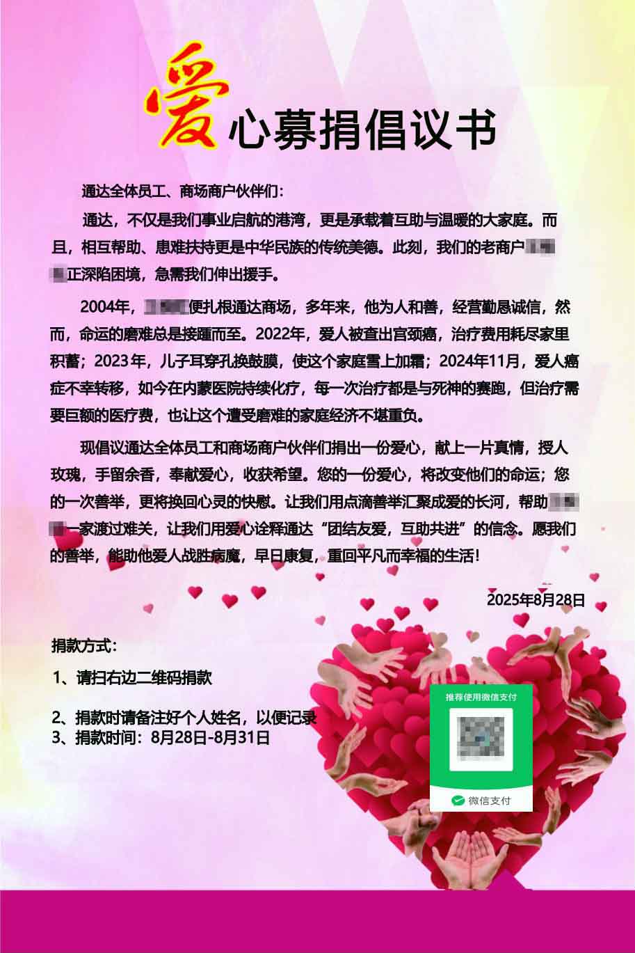 商場(chǎng)經(jīng)營拓展部得知這個(gè)消息后,秉著“病魔無情人有情”和通達(dá)“互愛”的精神,向通達(dá)公司全體員工和商場(chǎng)商戶發(fā)出募捐倡議,號(hào)召大家伸出援助之手,共助W老板一家渡過難關(guān)。自8月28日愛心募捐書發(fā)出后,公司領(lǐng)導(dǎo)層率先垂范、帶頭捐款,各分公司員工也積極響應(yīng),無論是朝夕相處的商場(chǎng)員工和商戶,還是素未謀面的其他分公司員工,都紛紛踴躍加入,以實(shí)際行動(dòng)奉獻(xiàn)自己的愛心。30元,50元,100元,200元,300元……捐款不分多少,善舉不分先后,一筆筆捐款承載著每位愛心人士的真誠愛心,寄托著大家的深深祝福。